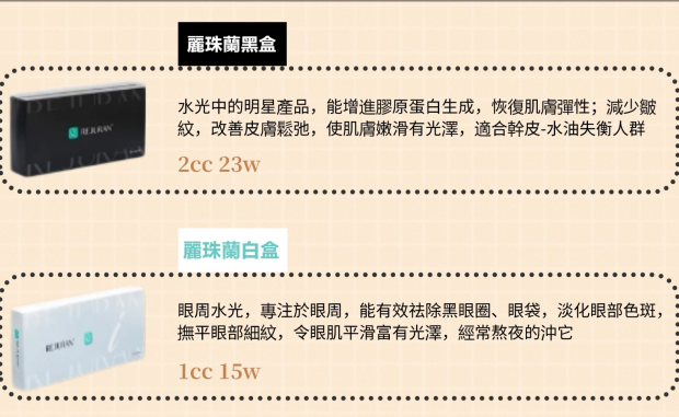 ▫️ 紅盒:單次局部治療(額頭/下巴)1000-1800元,單次全臉治療2000-3000元,3次療程5000-8000元。因主打初抗老,價格最親民,是新手入門首選。